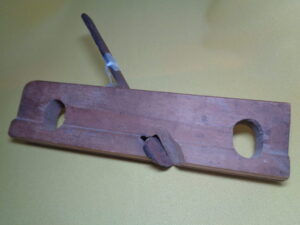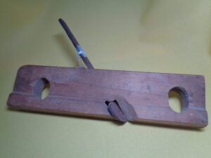 The “Antique Primitive Wooden Block Planar” is an antique original woodworking tool made of wood. It is a plane used for manually shaping and smoothing wood surfaces. It is often used for precise projects, like making wood molding.