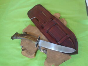 The handle is hand-stained antler sourced locally from Nebraska, and the guard is handmade and custom fitted. The leather sheath is handmade and stained, with a special design that allows the inner section to be removed.