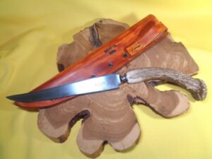 This knife was remade from an USA-made Universal LF&C knife manufactured in the 1900s-1910s. The blade is high carbon shear steel, and was reshaped while the handle and sheath are all custom-made in house.